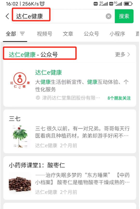 1、关注“达仁e健康”微信公众号