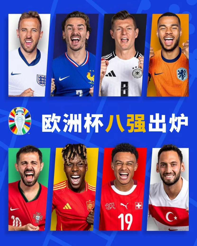 2024欧洲杯足球赛1/8决赛鸣金收兵,8强全部落位,巅峰对决,即将上演!绿茵场上风云变幻,每一瞬间都如雷鸣电闪,激荡着全球球迷心中的狂热激情!八支精英劲旅蓄势待发,剑指德劳内杯!